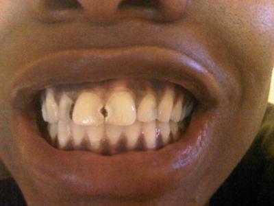 I have a big chip in the upper jaw between my front teeth. I think it is due to me eating corn on the cob. It's been like this for a year or so now and it seems to me that it's getting worse due to the color turning brown. I am just so embarrassed to smile!